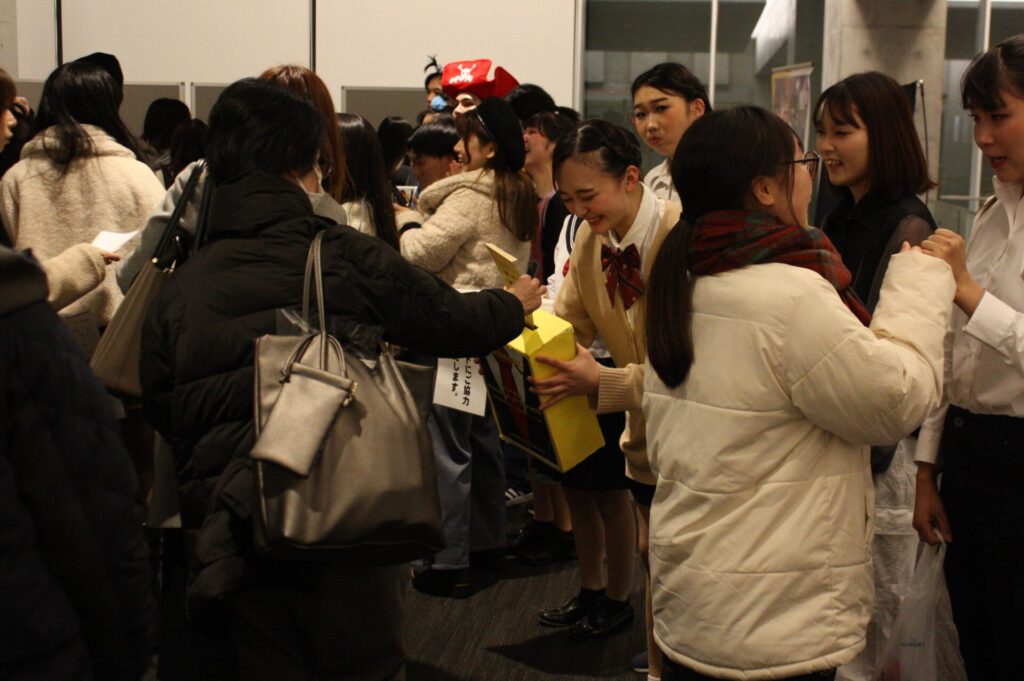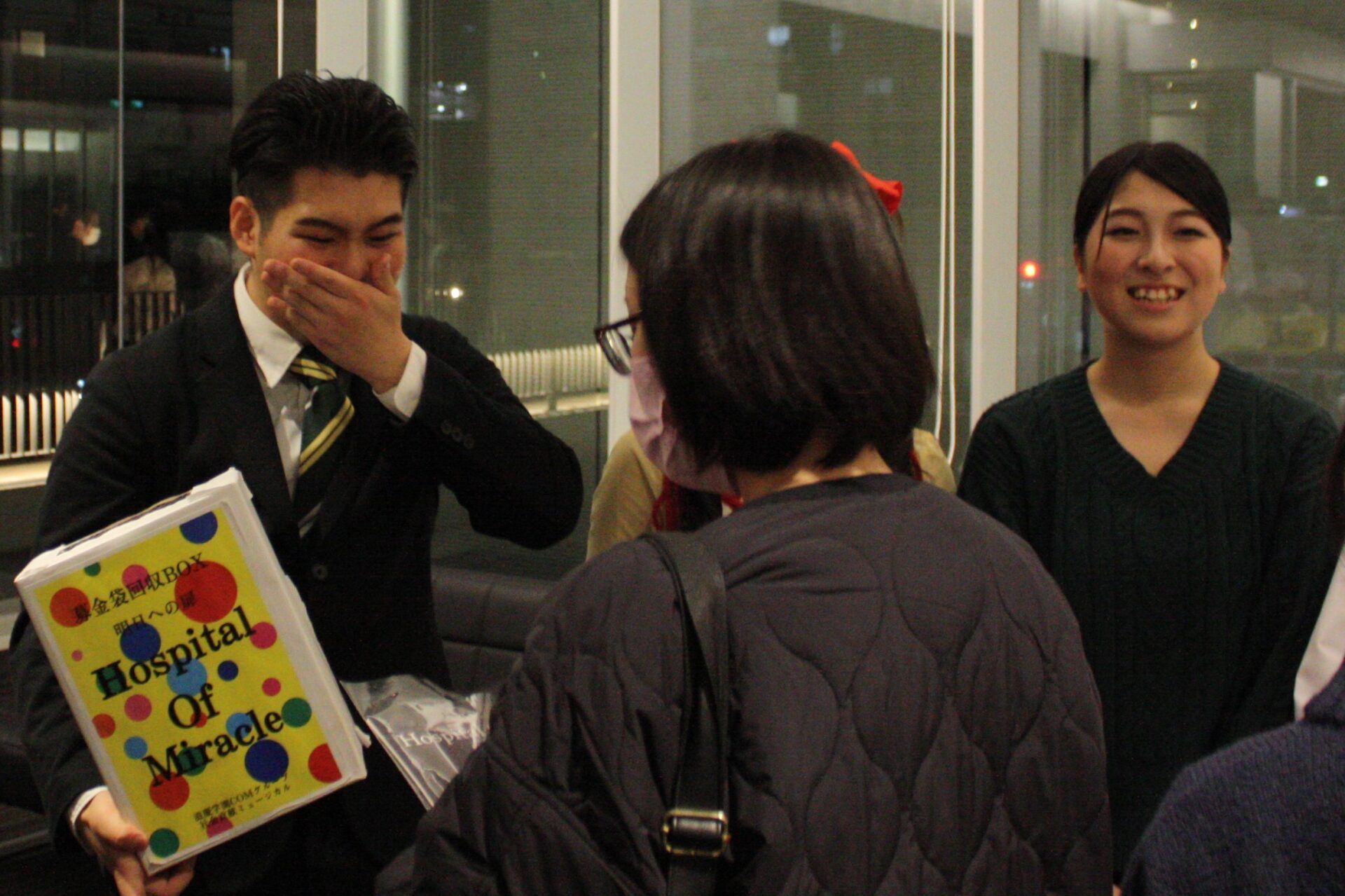 この後、出演者やスタッフの学生たちはロビーに立って募金のお願いをしました。募金は亡くなった夏目雅子さんの遺志を継いで、抗がん剤などで脱毛に悩む患者に無償でカツラを貸し出す活動を続けている「一般財団法人夏目雅子ひまわり基金」と「公益財団法人日本骨髄バンク」、「一般社団法人OSAKAあかるクラブ」などに寄付されます。