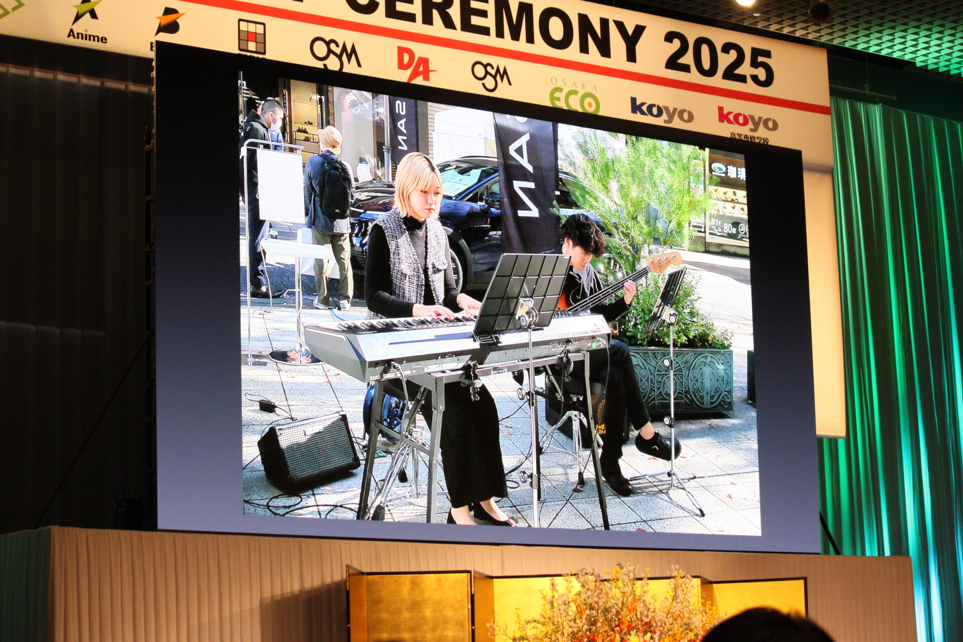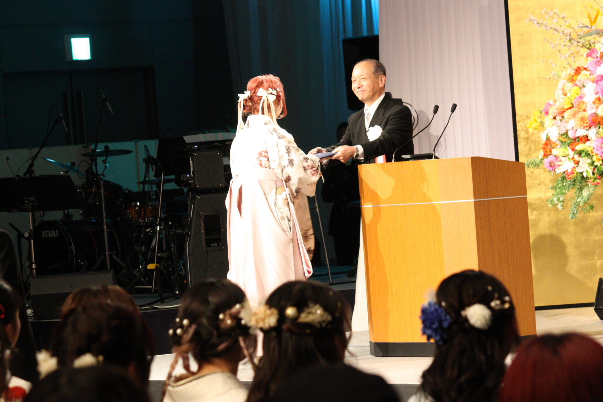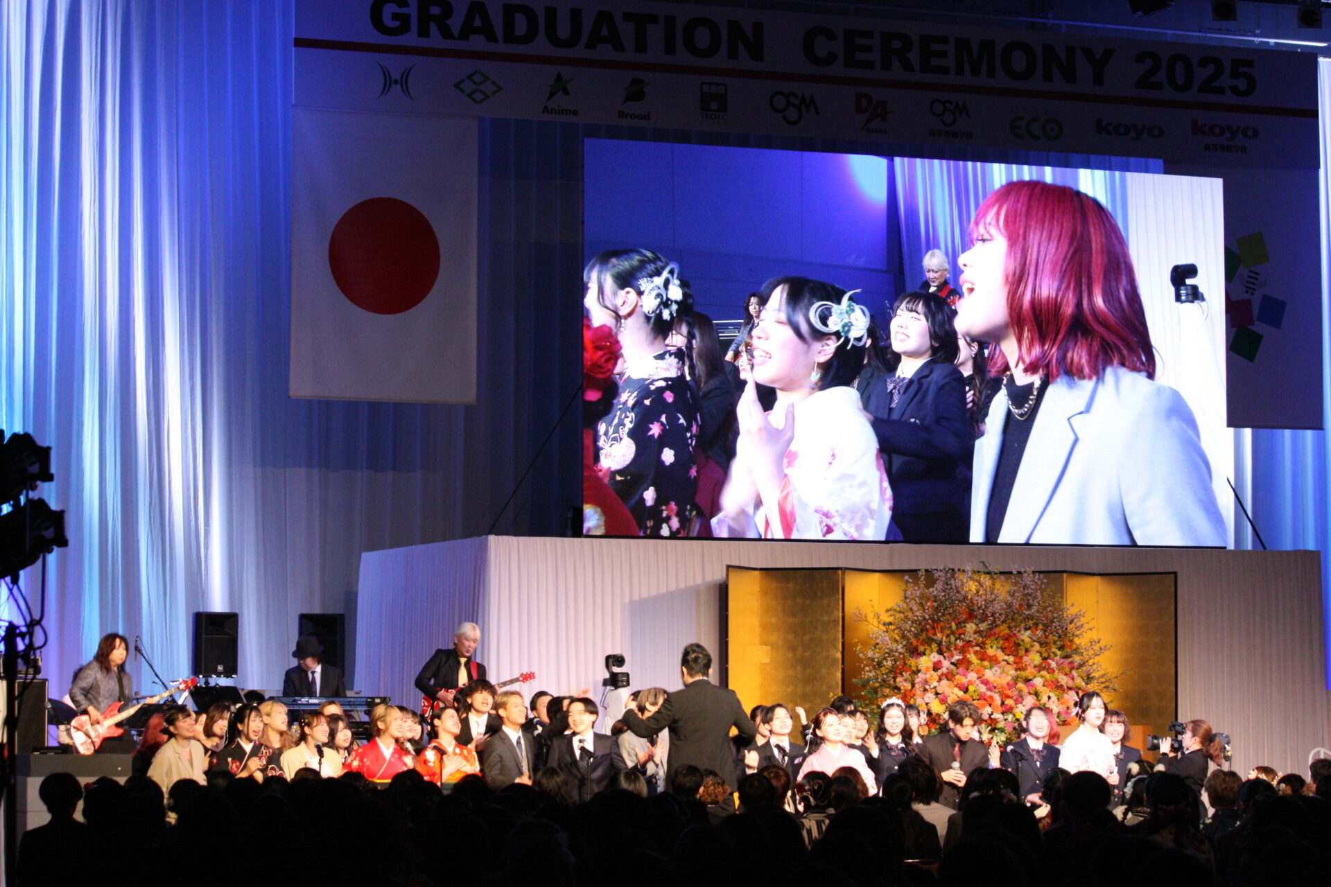 フィナーレではゴスペルアンサンブルのメンバーを中心に『翼をください』の歌で卒業生を送りました。演奏はベースが東京スクールオブミュージック&ダンス専門学校の学校長、渡辺敦子先生、キーボードは名誉教育顧問のミッキー吉野先生、ギターは教育顧問の引田寿徳先生、ドラムが海外教育顧問のトミー・スナイダー先生。そして指揮は教育顧問の近藤章裕先生でした。