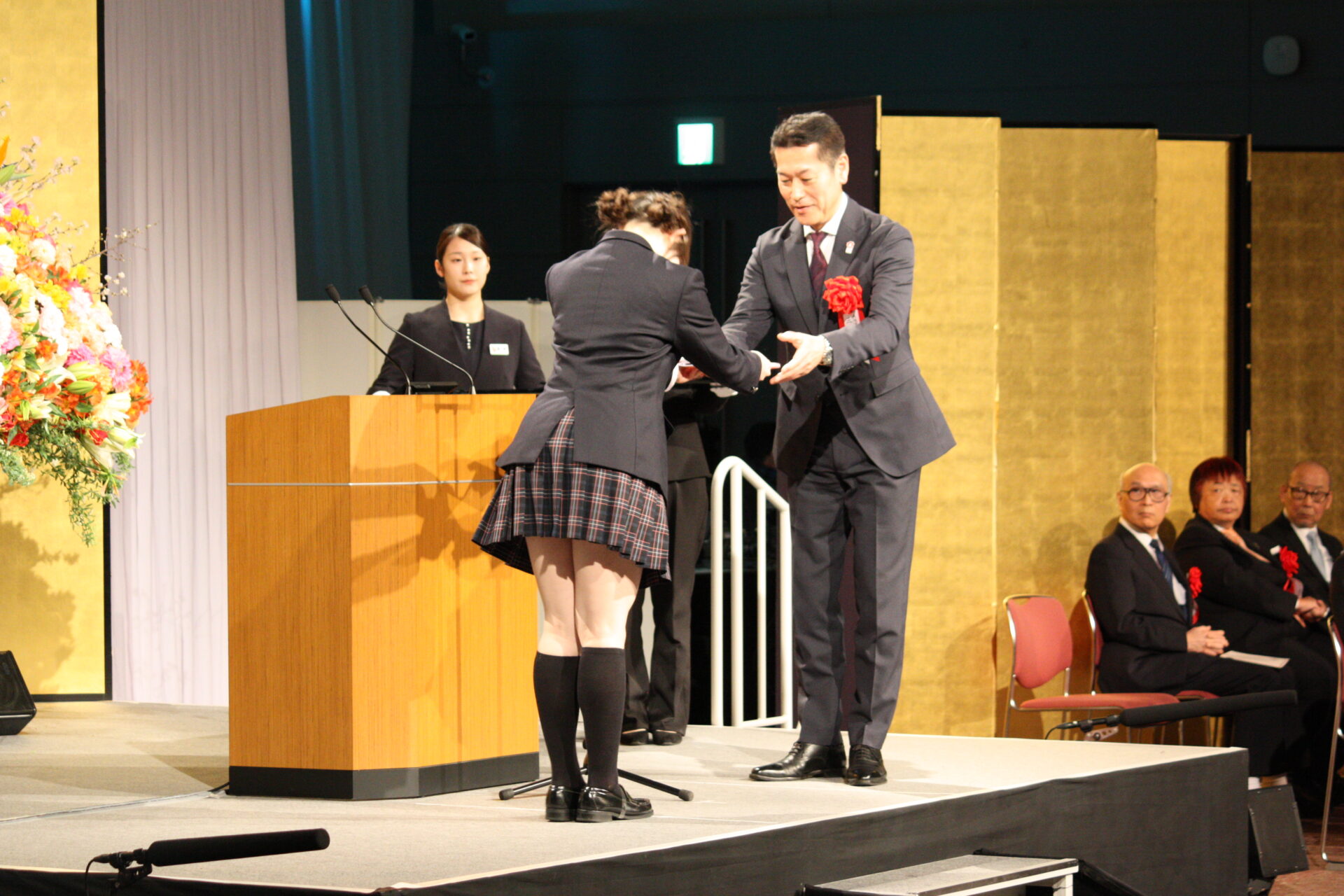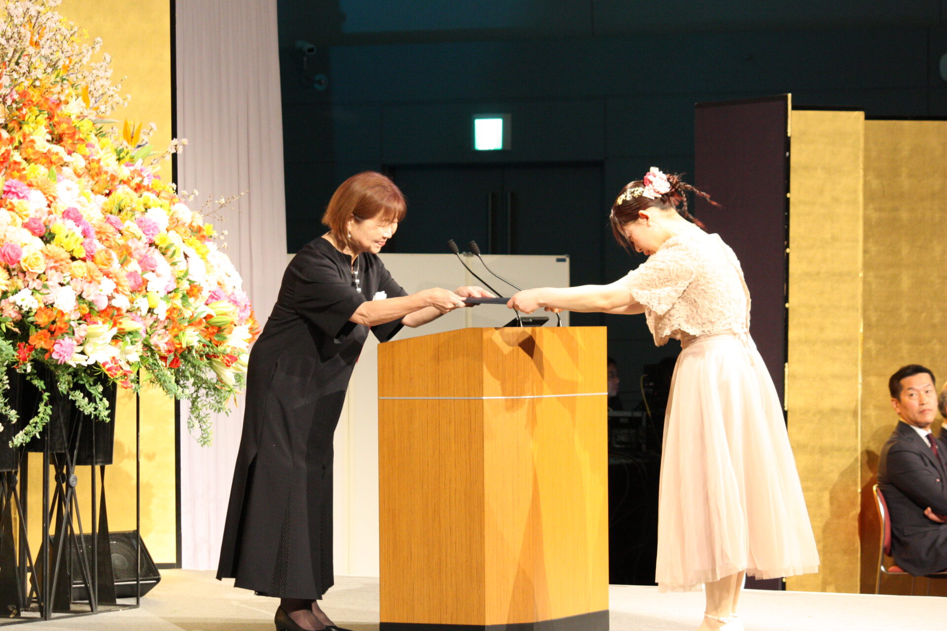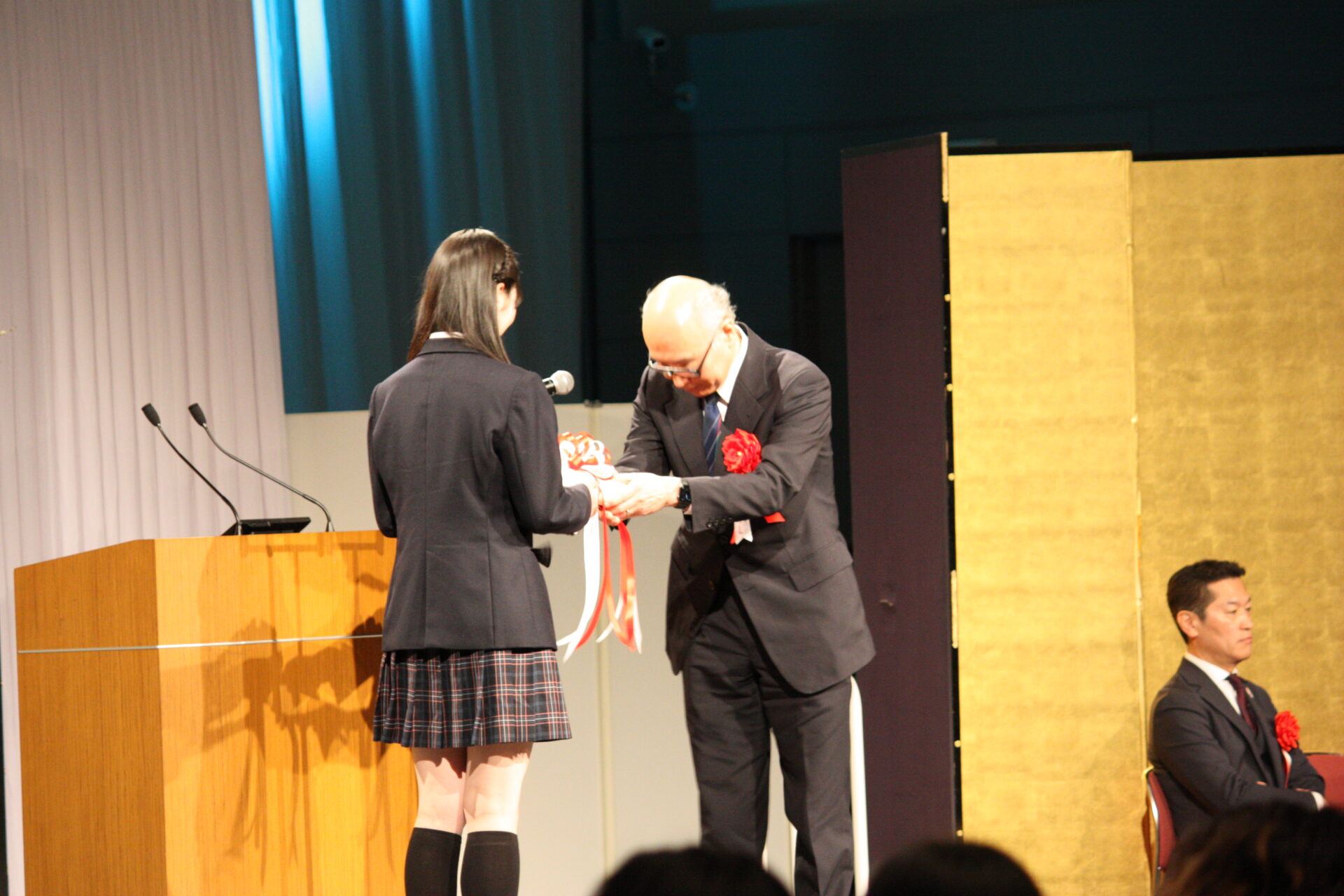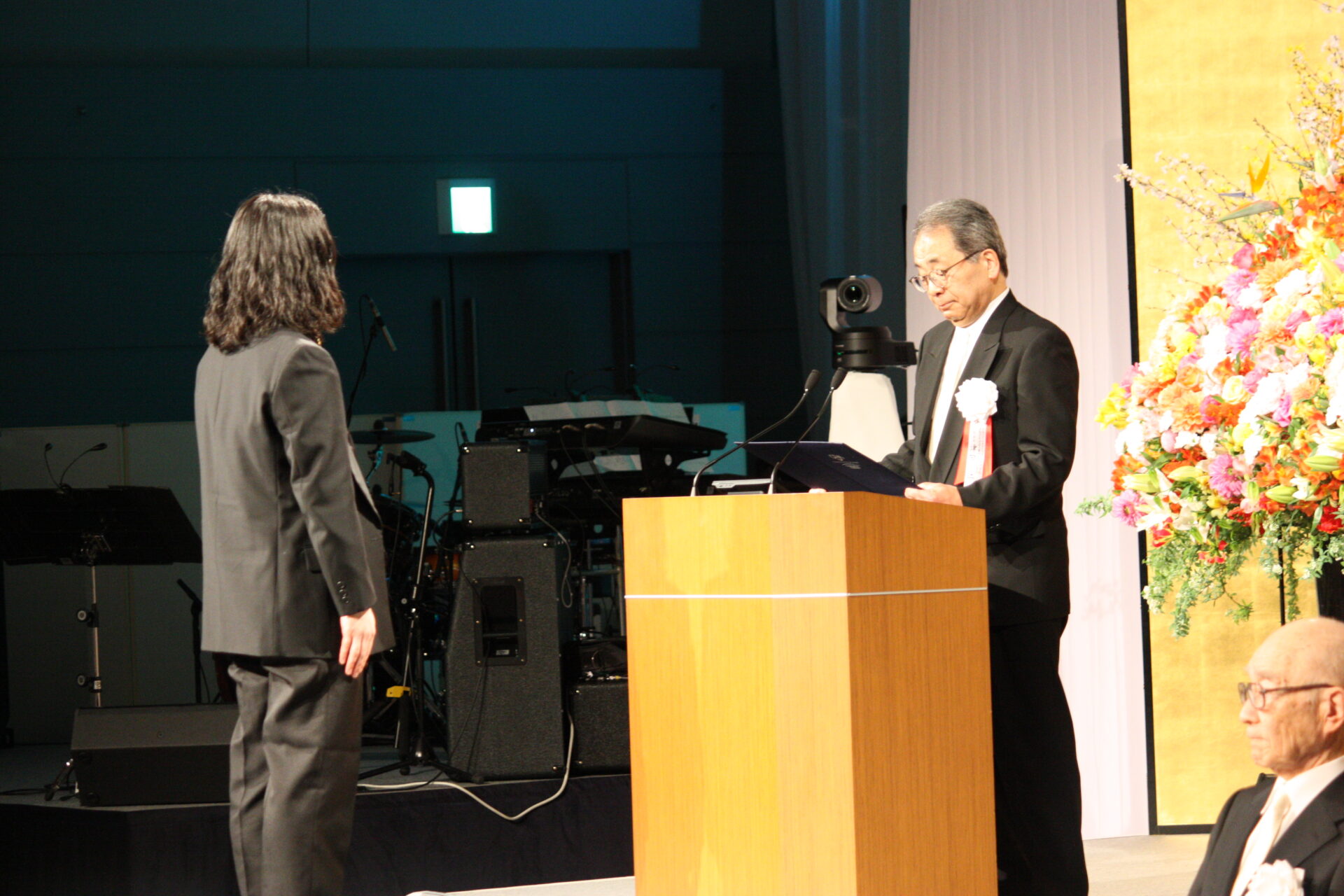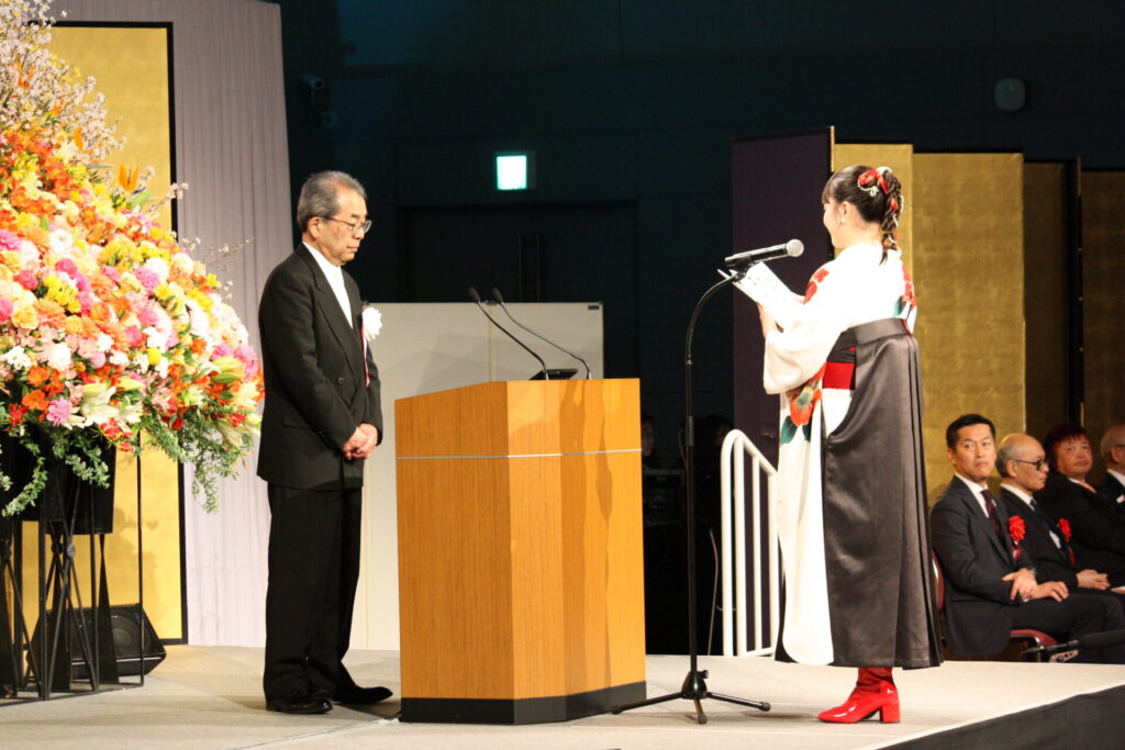 続いて寄付金の贈呈式です。大阪市西区にある姉妹校7校の合同学園祭での売り上げの一部を、地域振興を目的として三村浩也西区長に贈呈し、三村区長から感謝状を頂きました。またミュージカル『明日への扉』と『明日への扉 Hospital Of Miracle』の公演で寄せられた募金は、公益財団法人 日本骨髄バンクと一般財団法人 夏目雅子ひまわり基金に贈呈され、目録が読み上げられました。