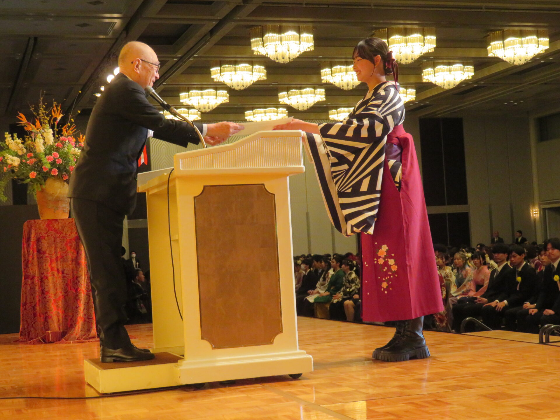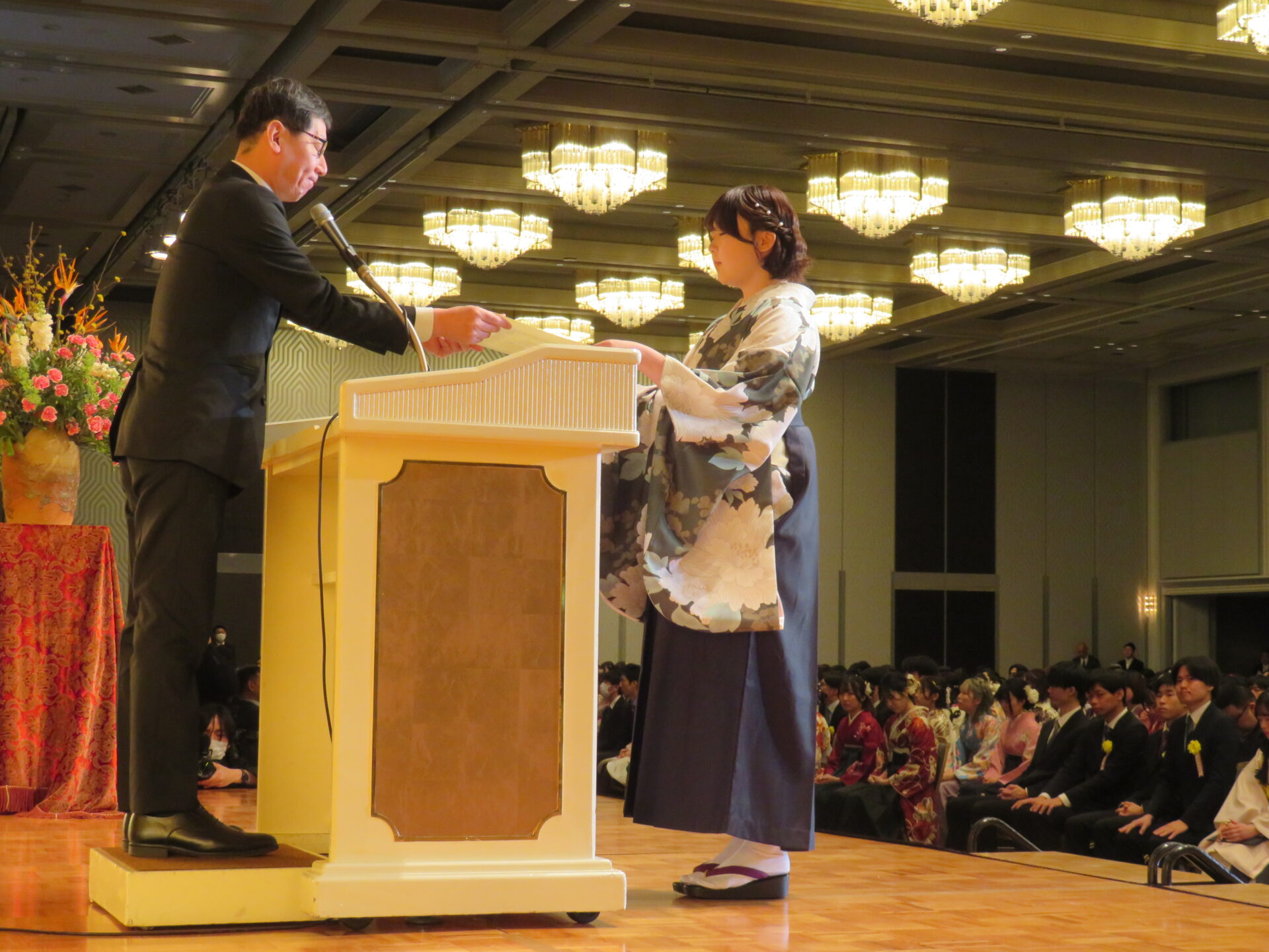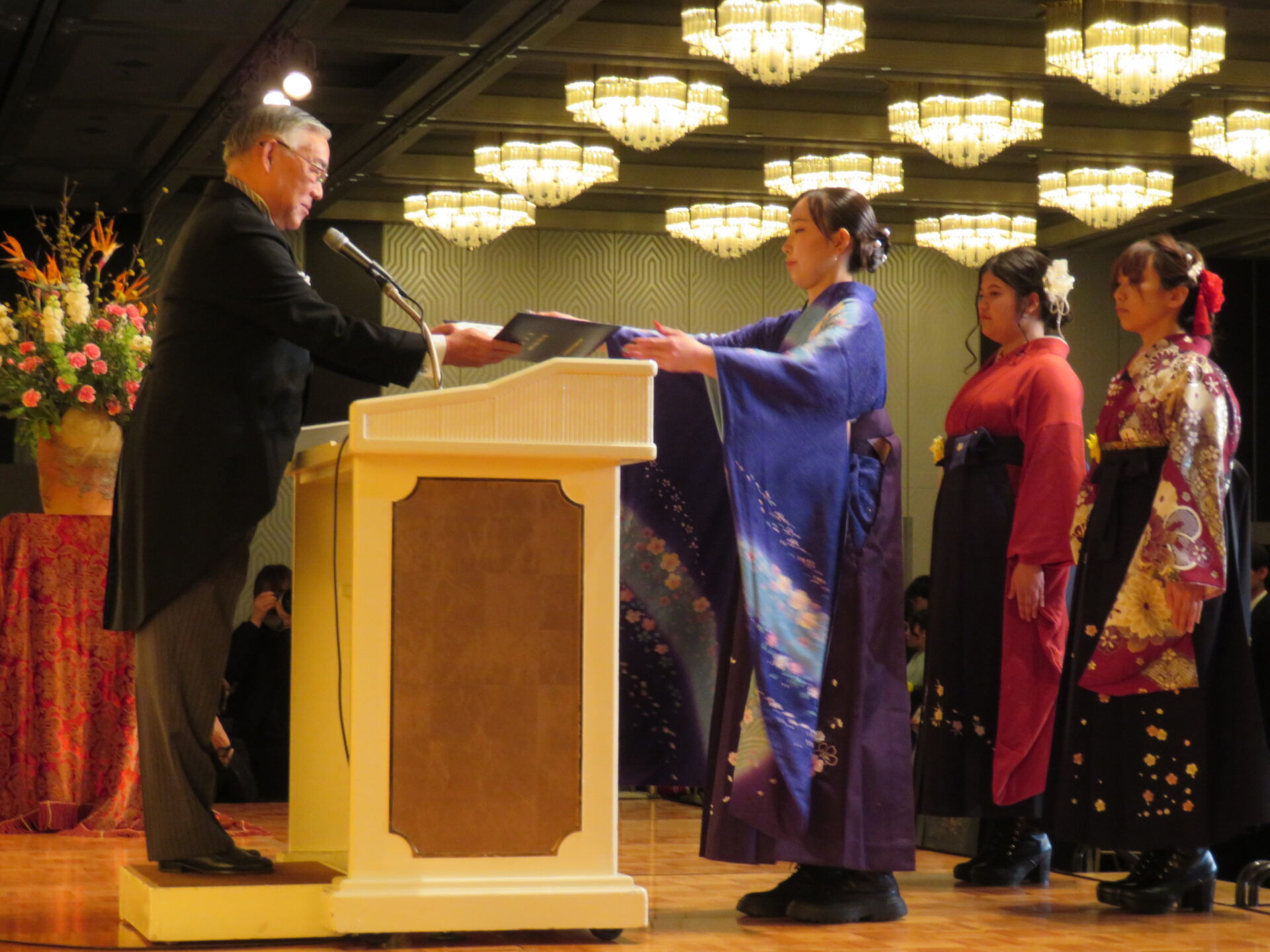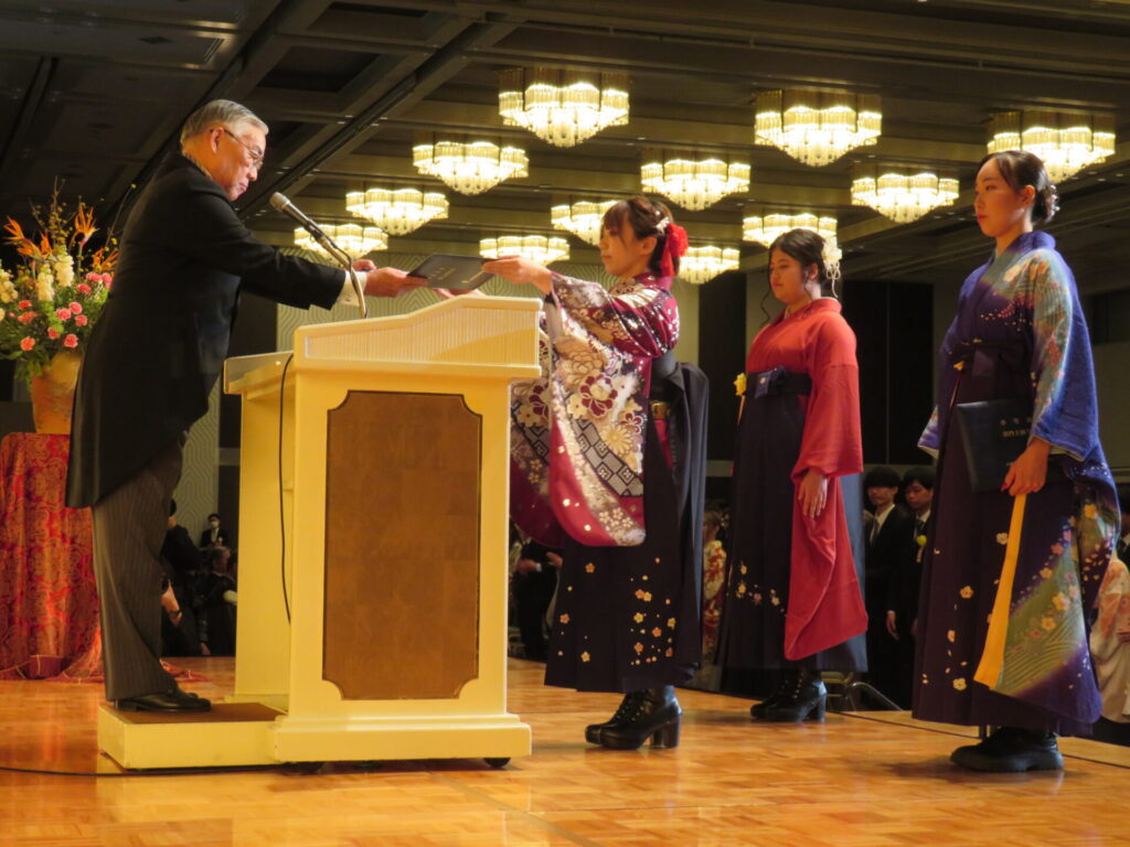 続いて卒業生総代として大阪医療技術専門学校 鍼灸美容学科の矢野小夏さん、大阪医療福祉専門学校 作業療法士学科の小林奈央さん、大阪医療看護専門学校 看護学科の森下里都さんが登壇し、卒業証書と専門士称号が授与されました。