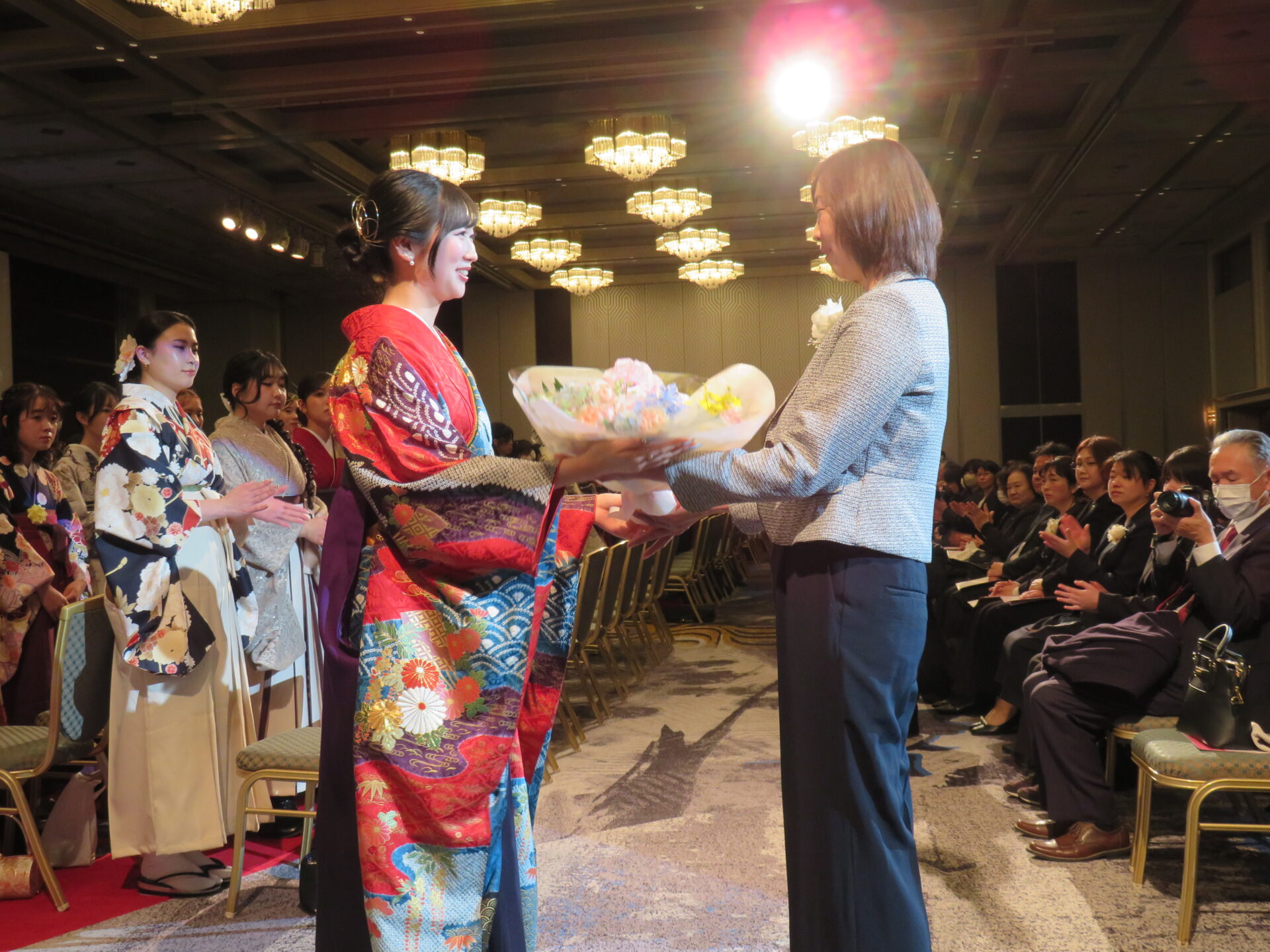 そして、「私は臨床検査技師として、検査データを通じて『命を支える』という重要な役割を担います。これから進む道で迷うことがあっても、その責任の重さを胸に刻み、日々成長していくことを誓います」と述べ、花束をお母さんに贈りました。