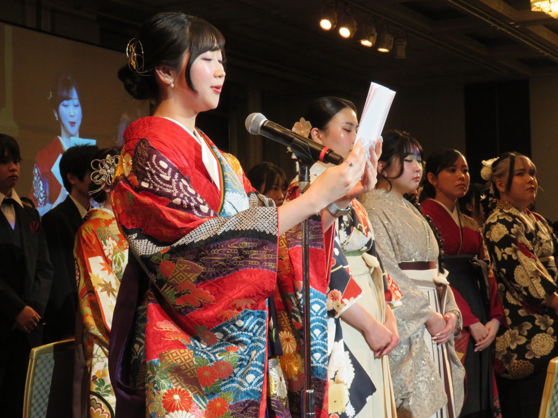 式典の終わりに卒業生が感謝の言葉を述べました。大阪医療福祉専門学校 視能訓練士学科の水縄真友さんは「初めての長期実習では自分の技量が追いつかず、涙をこぼしたこともありました。それでも仲間と励まし合い、先生方に支えていただくことで、前を向くことができました」と学生時代を振り返りました。
