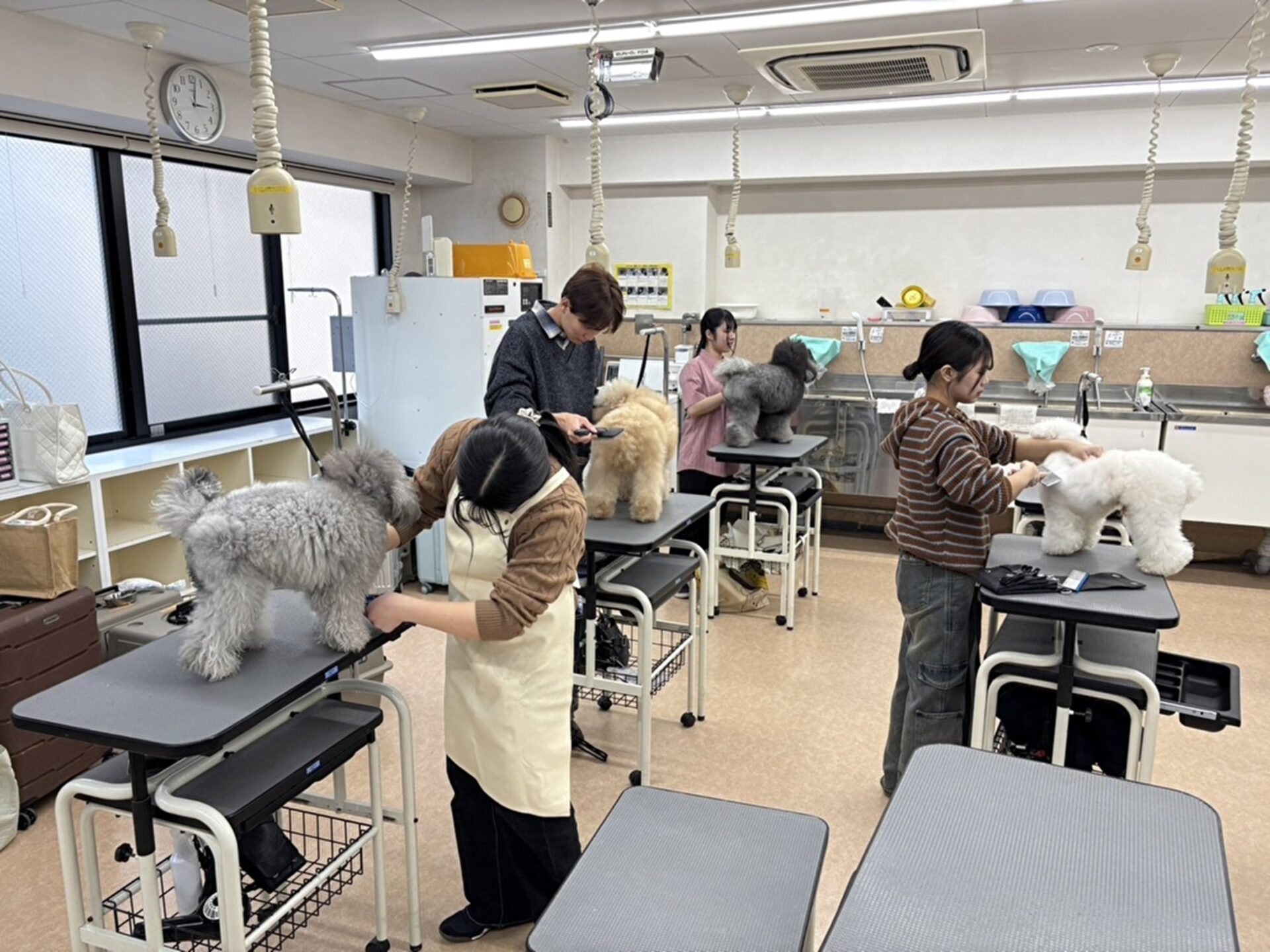 今回、コンテストに出場した3年生2名、2年生2名の計4名は、放課後や空き時間も活用し、モデル犬の状態や時間配分を意識した実践的な練習を重ねてきました。大会前日には会場でリハーサルを行い、道具の配置や動線の確認など本番を想定した最終調整を実施。その後は、大会当日に最高のコンディションで臨めるよう丁寧にシャンプーを行い、万全の準備を整えました。