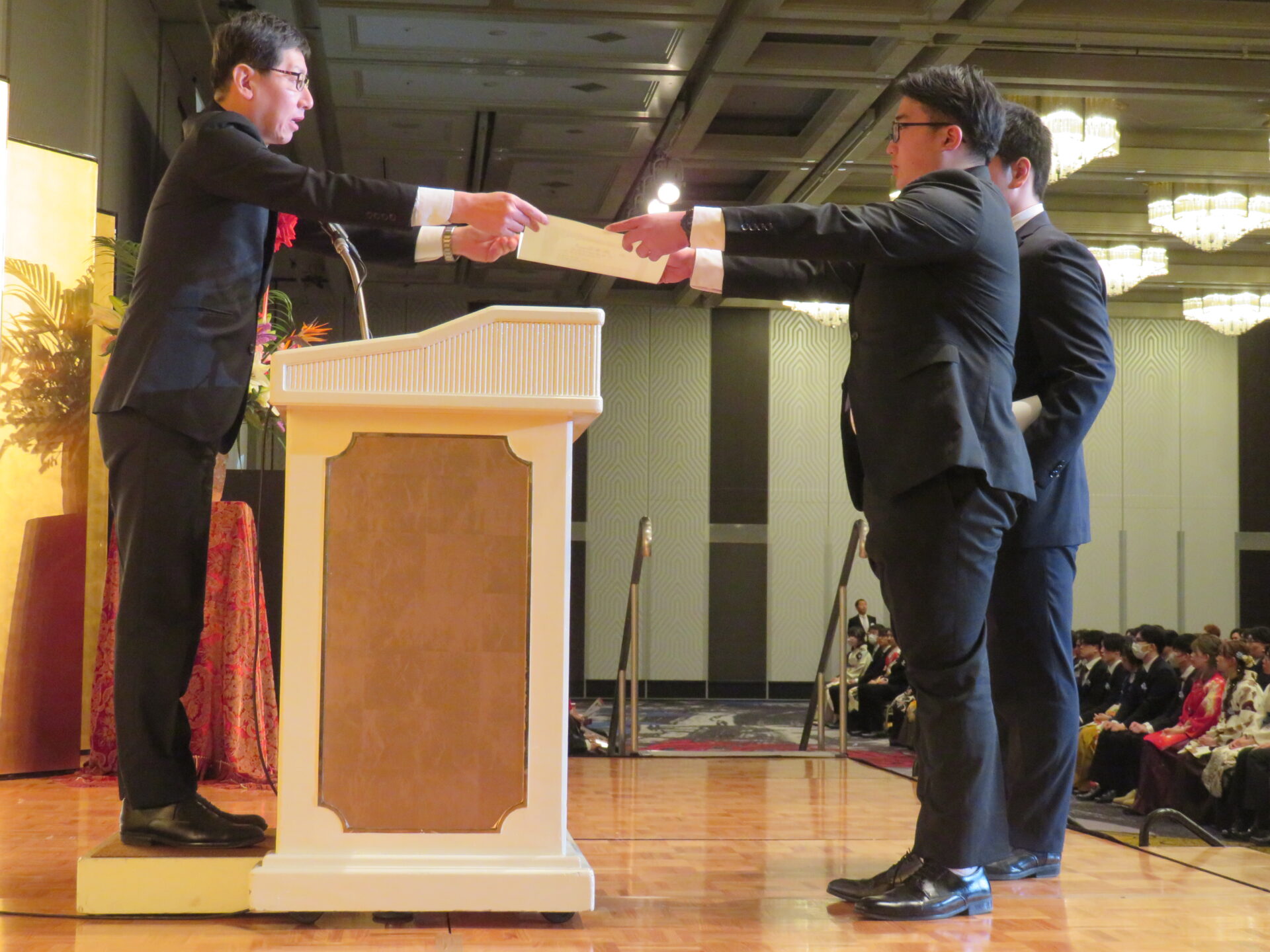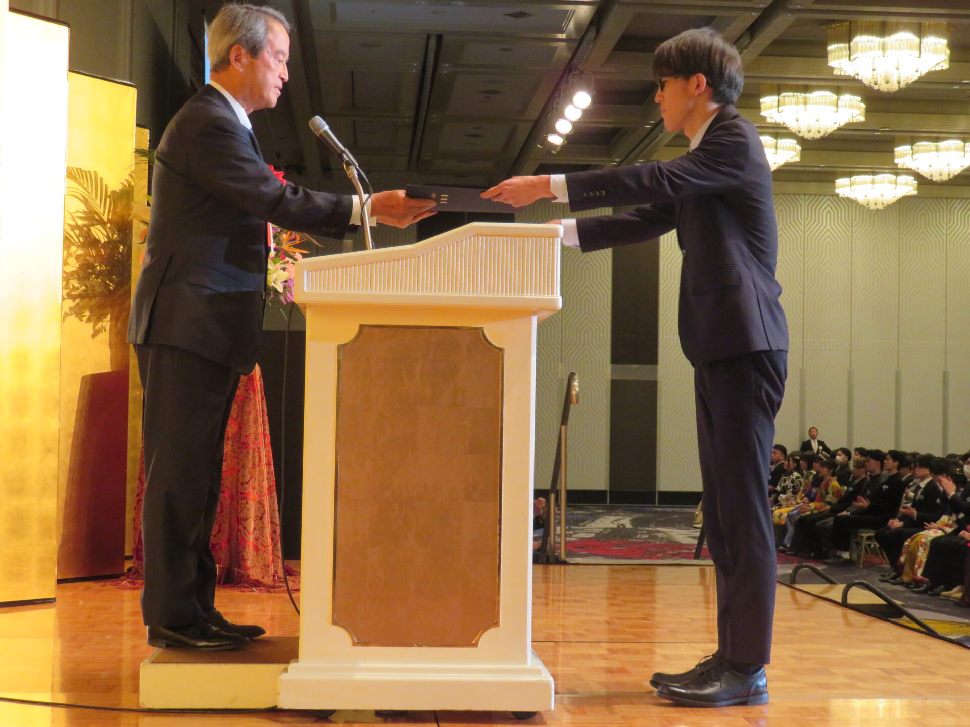 代表して大阪ハイテク スポーツ科学科の笹岡大芽さんと、大阪保健福祉 保健保育科の小林蒼宙さんが登壇。橋本学校長から卒業証書と高度専門士・専門士称号が授与されました。