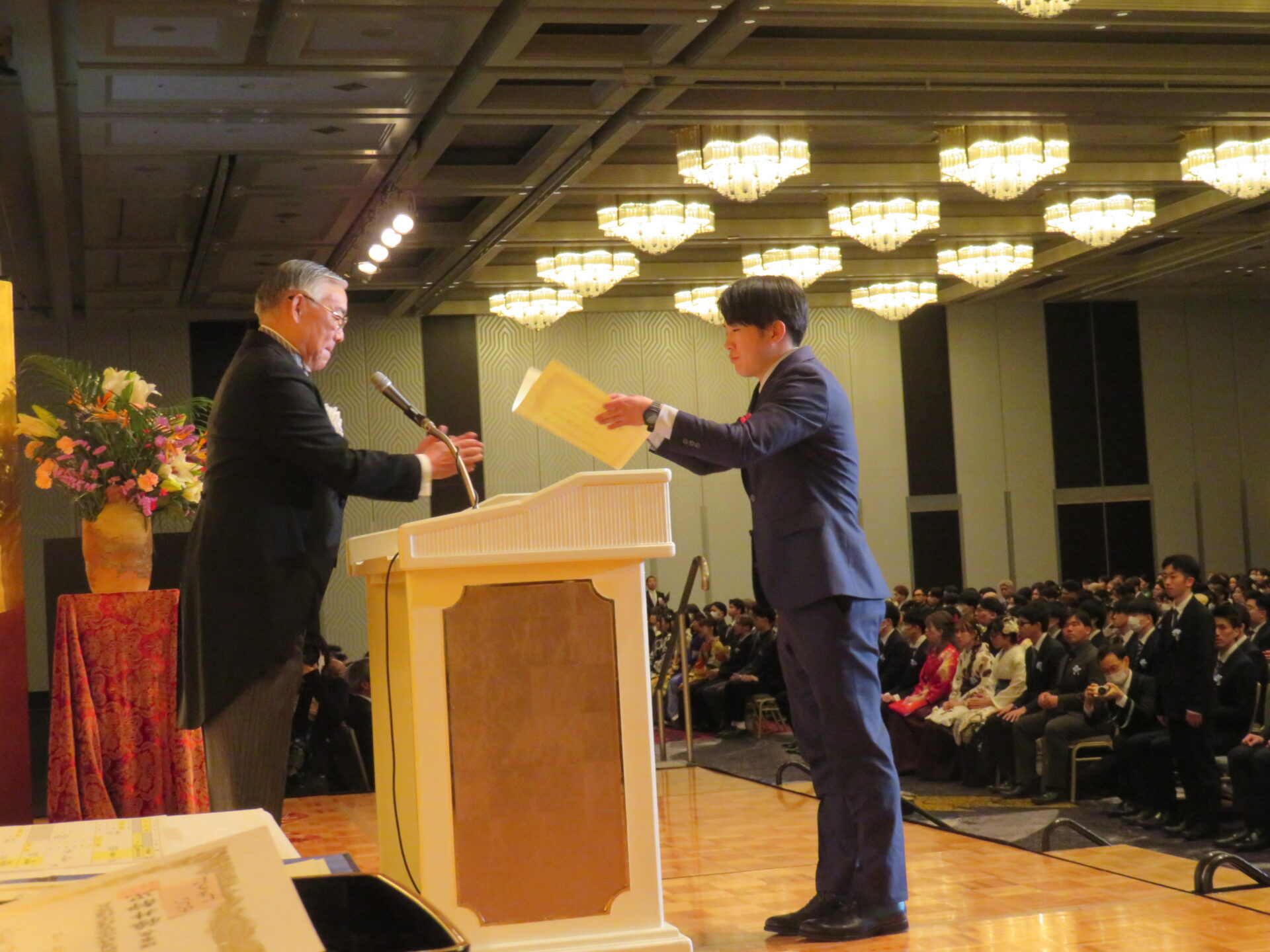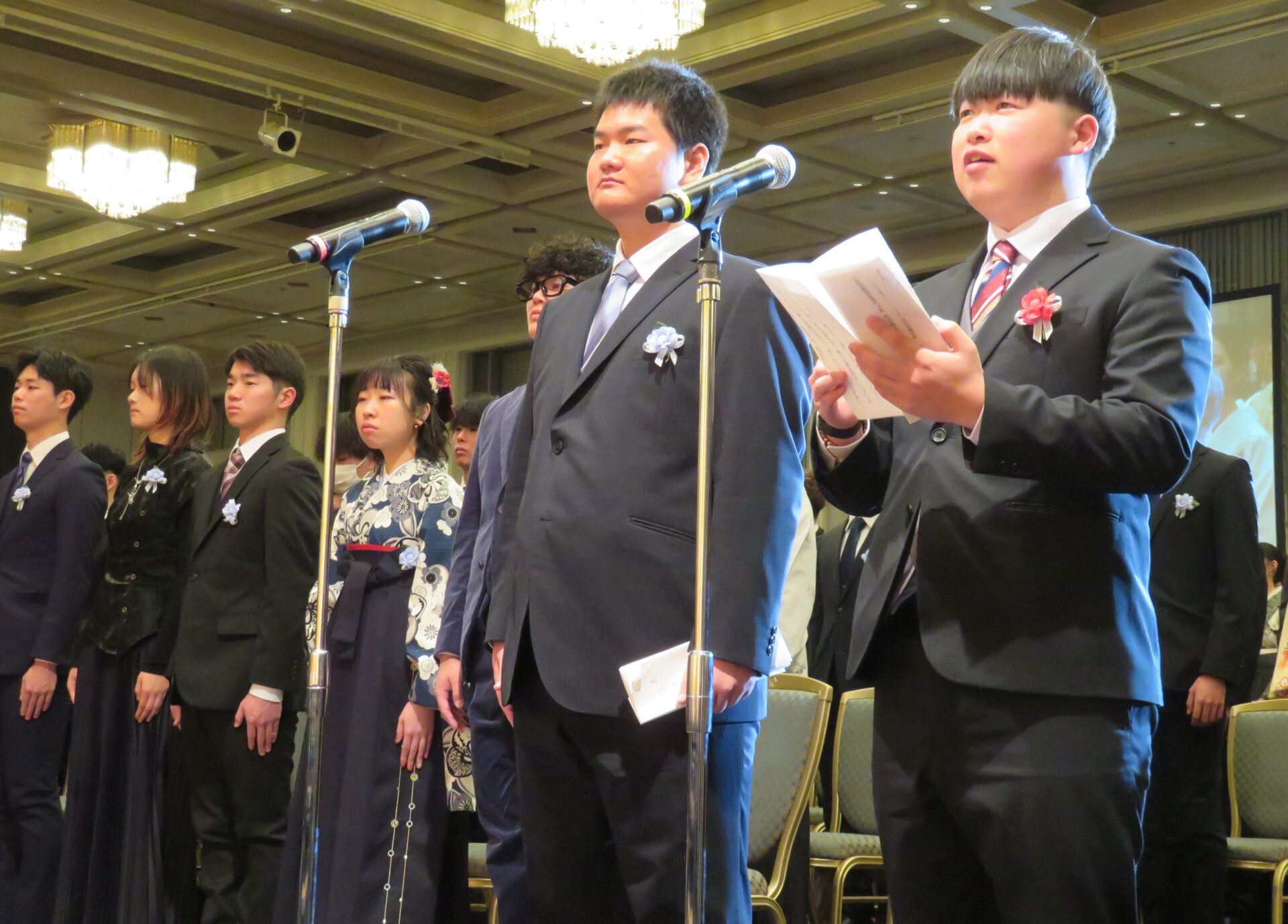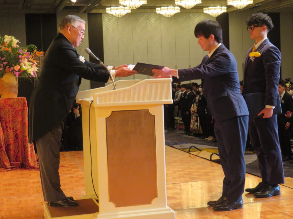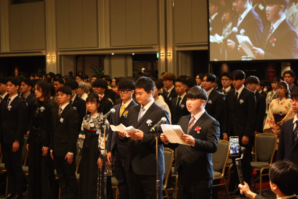 式典の最後に大阪ハイテクノロジー専門学校 バイオ・再生医療学科の福菅佑真さんと、大阪保健福祉専門学校 社会福祉科の坂東蒼太さんが卒業生を代表して感謝の言葉を述べました。