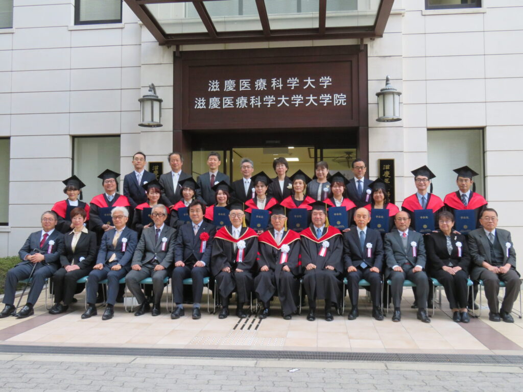 同大学院は学校法人 大阪滋慶学園が運営し、日本初の「医療の質と安全」を学ぶ滋慶医療科学大学院大学として2011年に誕生。滋慶医療科学大学の発足に伴い名称が変更になりました。これまでの修了生は病院、医療施設、医療機器メーカーなどでリーダーとして活躍中です。今年の修了生は13人。なかには学校の教員でスポーツ科学の指導をしているアスレチックトレーナーもいました。