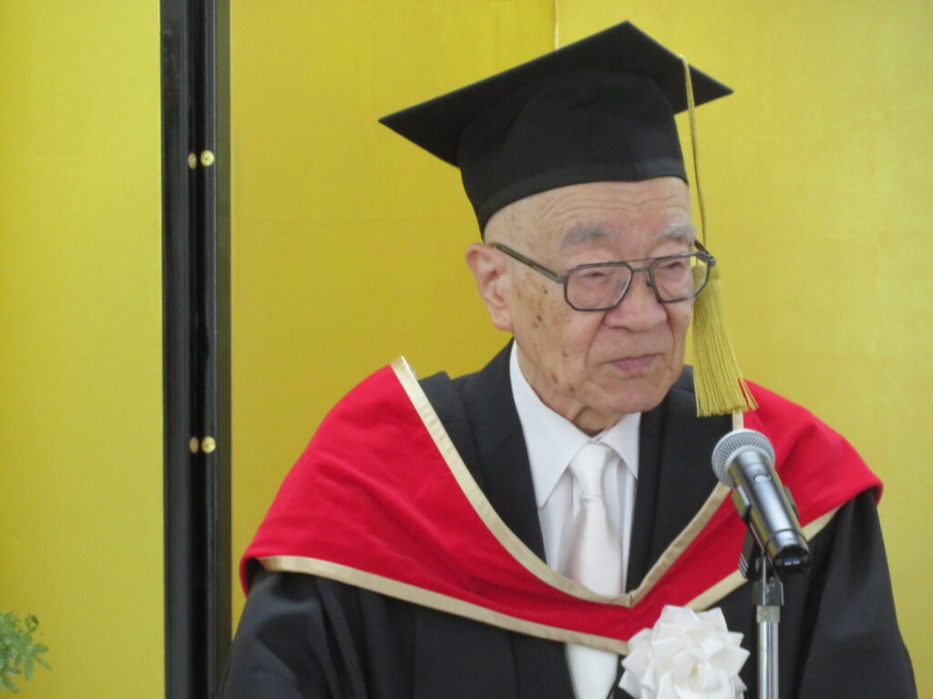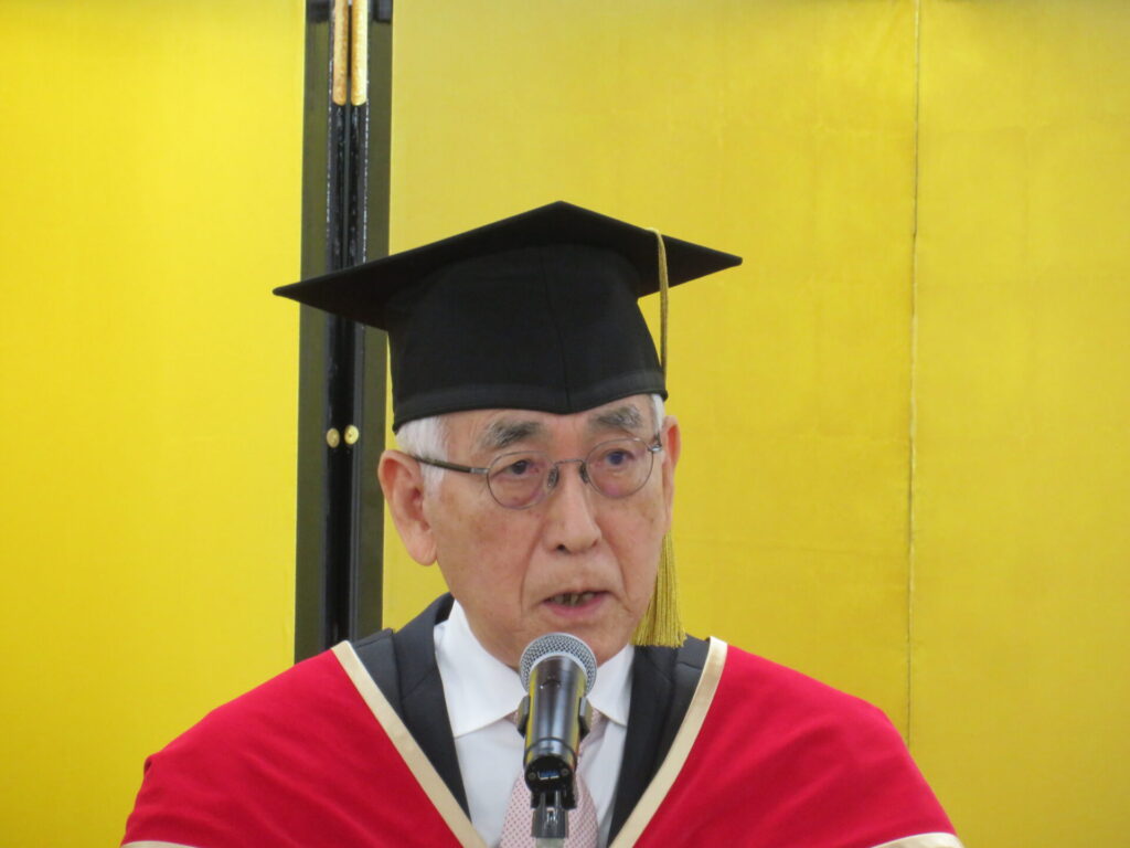 千原國宏学長は告辞で、「皆さんは社会人としての職責を果たし、家庭を支えながら大学院の高度な学びに挑戦。限られた時間と体力の中で、知識力・探求力・人間力を深め研鑽を積まれました。その不屈の努力に心から敬意を表します」と称えました。