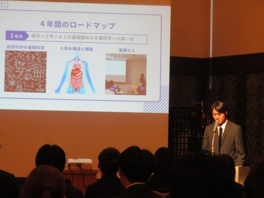 さらにAIやデータサイエンスが発展する現代において、学ぶべき姿勢について指針を示し、「医学と工学の専門的な知識や技術はもちろん、主体的に考えて行動し、積極的に学びを深めてほしい。AIを使わなくてすむ時代はもう来ません。だからこそ人間力が重要になります」と強調。コミュニケーション力、問題解決力、プレゼンテーション力、マネジメント力を身につけるよう求めました。