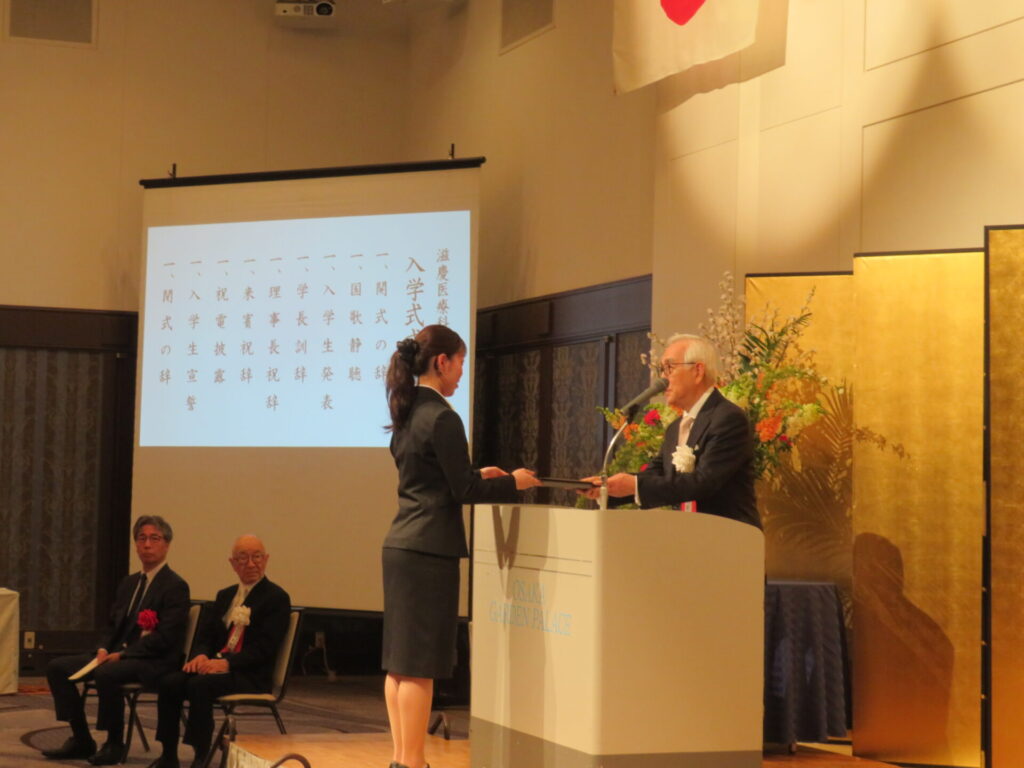 式典では臨床工学科と診療放射線学科の新入生の発表に続き、千原國宏学長が訓辞を述べました。大阪滋慶学園の理念である「実学教育」「人間教育」「国際教育」に触れながら、「本学は2021年に臨床工学科を開設し、今年は新たに診療放射線学科を加え、二学科体制で新たな歩みを始めました」と述べ、それぞれの職種の重要性について語りました。