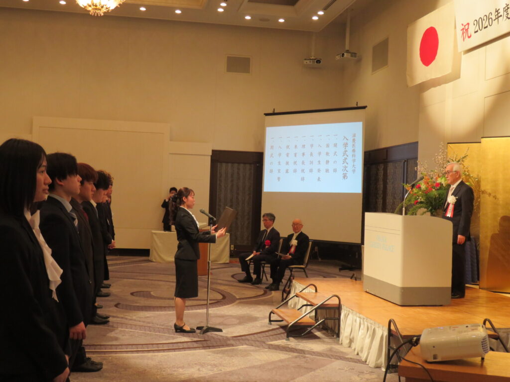 式典の終わりに入学生を代表して、診療放射線学科の南條芽依さんが宣誓を行いました。南條さんは正確な画像診断や放射線治療によって命を支える仕事に関心を持ち、この大学を選んだといいます。「診療放射線技師は目立つ存在ではなくとも、医療を支える見えない糸のような役割」と言い、そのあり方に魅力を感じると語りました。