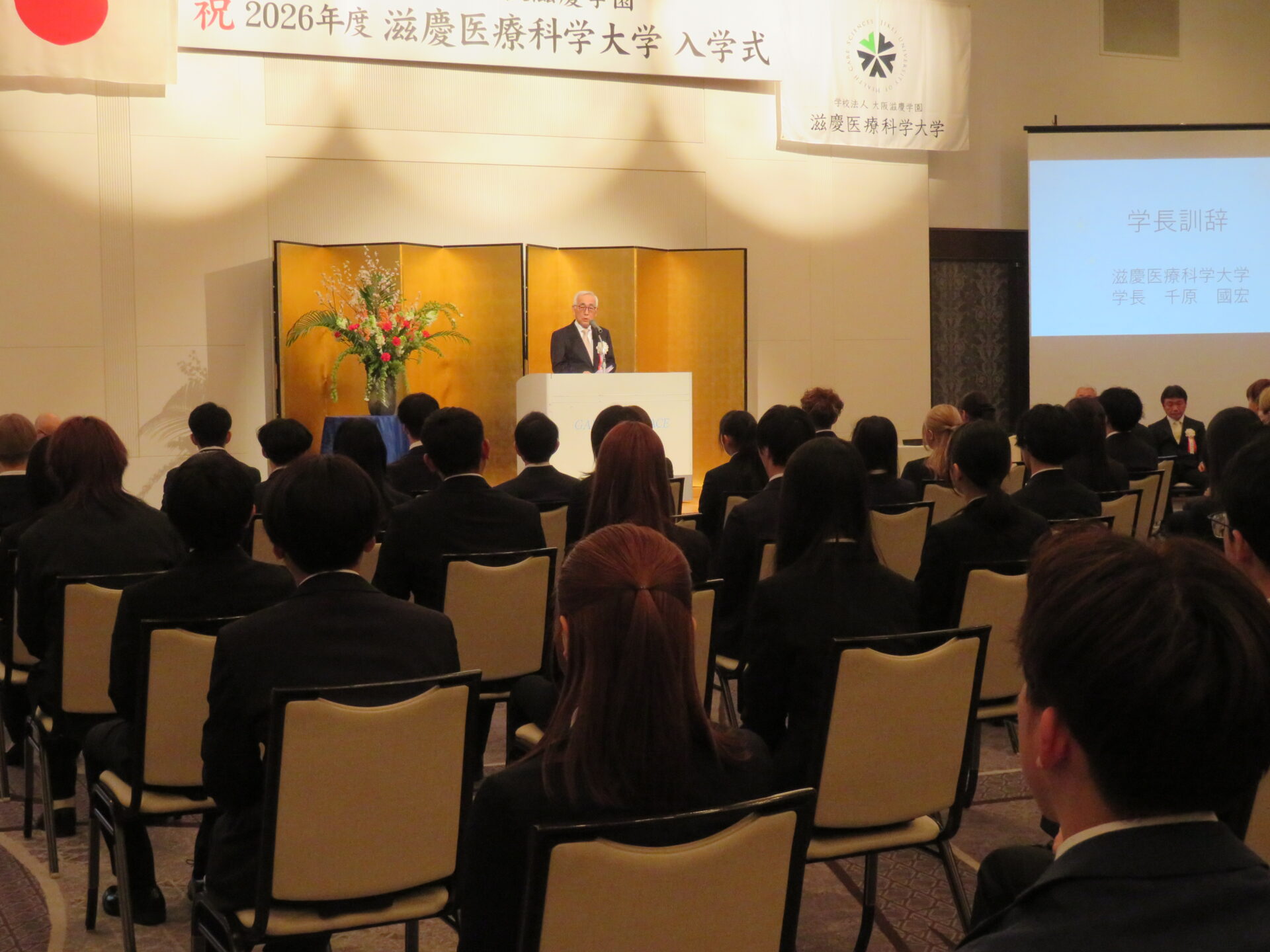 大阪の桜が満開となった4月4日(土)、学校法人 大阪滋慶学園が運営する滋慶医療科学大学の入学式が行われました。今年度の新入生は、開学当初からの臨床工学科の第6期生43名に加え、新たに設置された診療放射線学科の第1期生45名の計88名。治療と診断を高度な技術で支える医療のスペシャリストへの第一歩を踏み出しました。