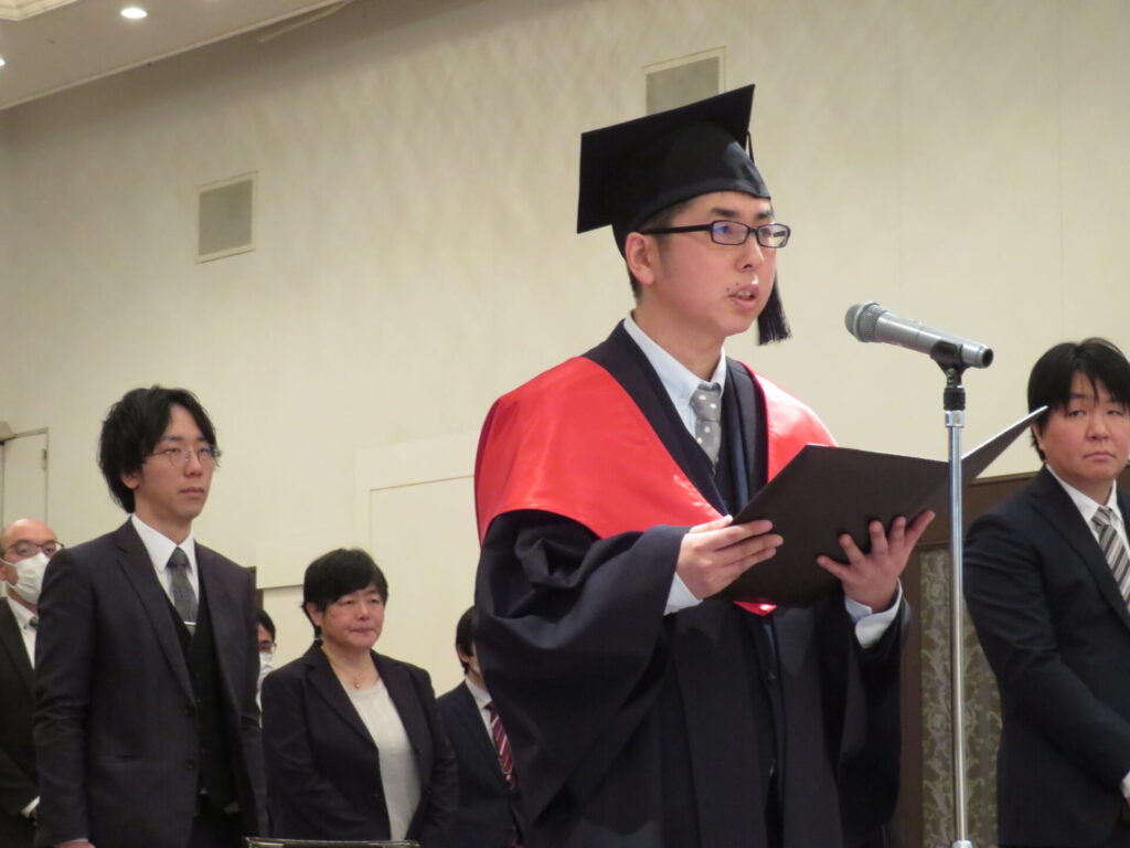 式典の締めくくりは、新入生代表の医療管理学研究科、小橋一雅さんによる宣誓です。小橋さんは、技術の高度化と患者ニーズの多様化によって、医療現場が複雑な課題に直面している現状を報告しました。「個人の努力や経験則のみに頼るのではなく、システムとして医療安全を根付かせることが重要であり、科学的な根拠の必要性を痛感しました」と語りました。