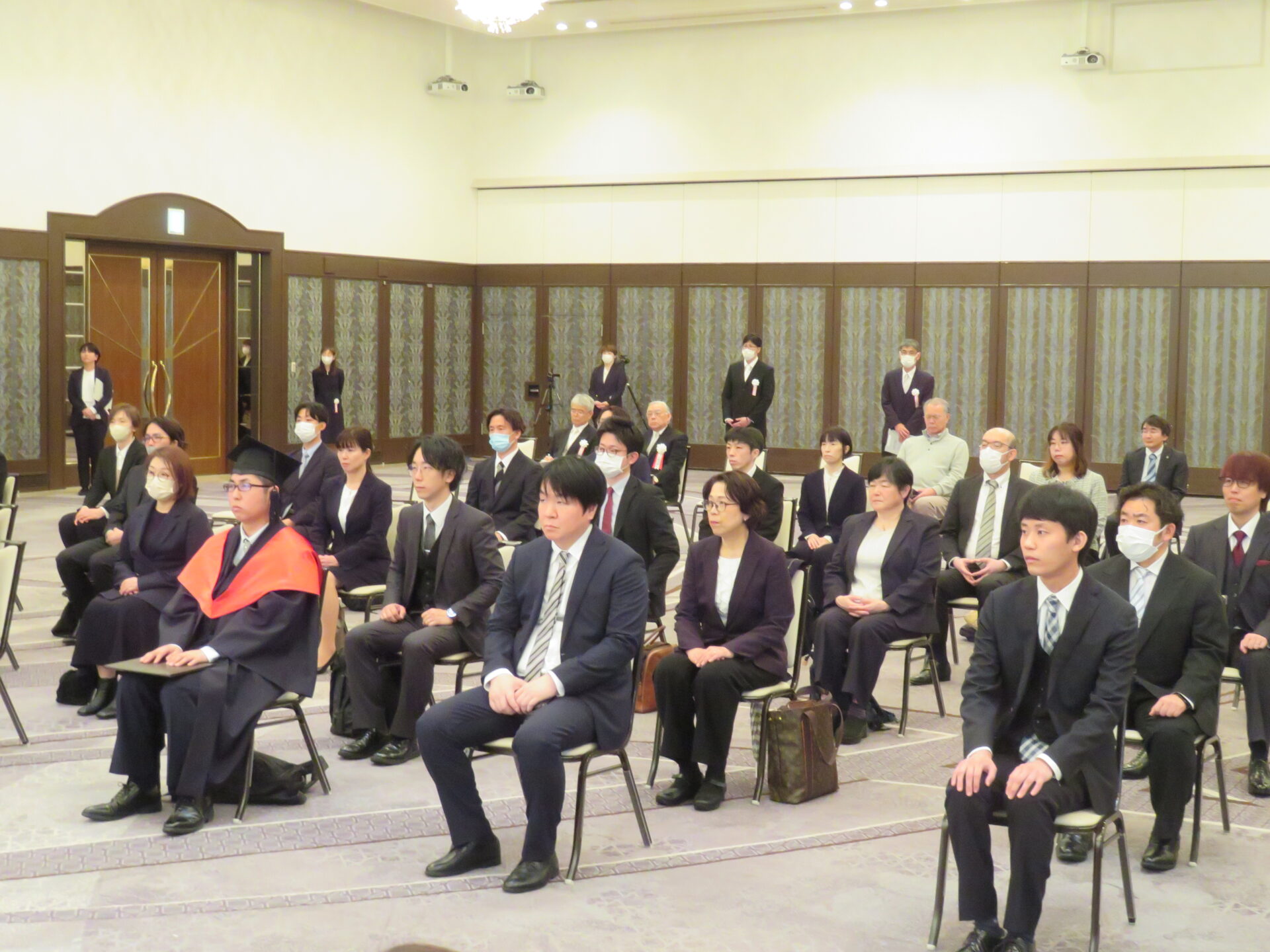 式典の冒頭、入学を許可された院生の名前が一人ずつ読み上げられた後、千原國宏学長が訓辞を述べました。学長は「学ぶ」ということについて、「単に知識を得ることではありません。社会の中での自らの役割を見つめ直し、より良い未来のために自分に何ができるのかを問い続ける営み」と語りました。多忙な仕事を持ちながら研究の道に進む院生たちは真剣な表情で聞いていました。