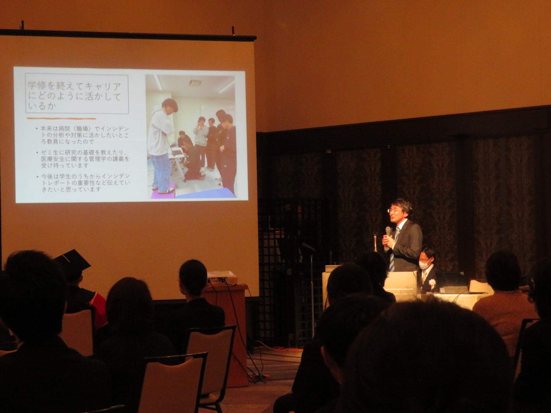 大学院の第12期修了生で、宝塚医療大学和歌山保健医療学部の准教授、椎木孝幸さんが、大学院での学生生活と終了後の活動についてスピーチしました。椎木さんは理学療法士として29年間にわたり病院に勤務。管理職も務めてこられたスペシャリストです。2024年に大学院を修了後、大学教員に転身しました。