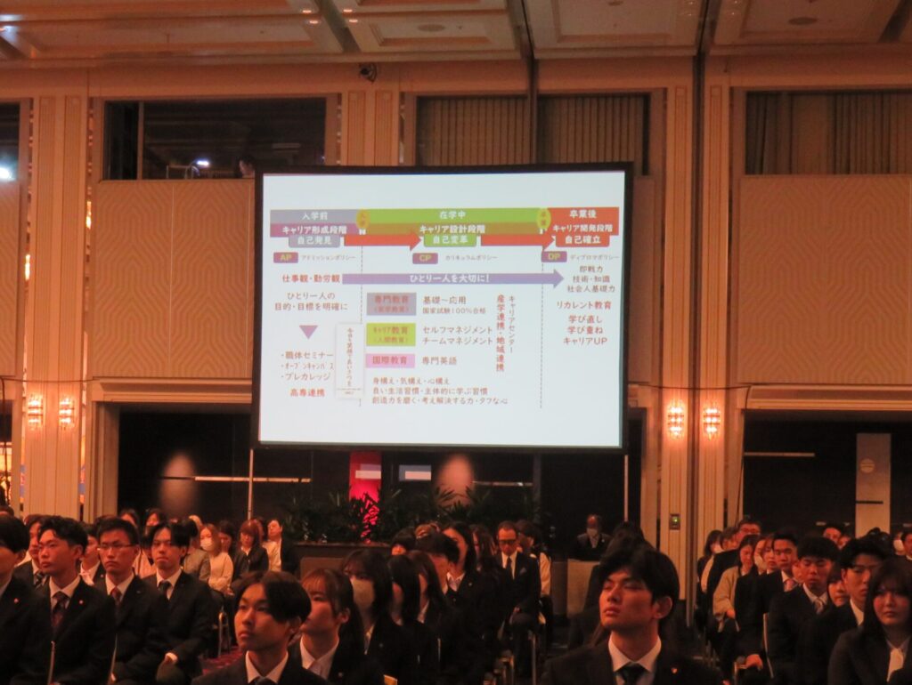 式典の締めくくりとして、これからの学生生活をイメージするためのスライドショーの上映がありました。画面には、白衣を身にまとい真剣な表情で実習に臨む先輩の姿や、スポーツ大会や学園祭で仲間とはじけるような笑顔を見せる瞬間が映し出されました。