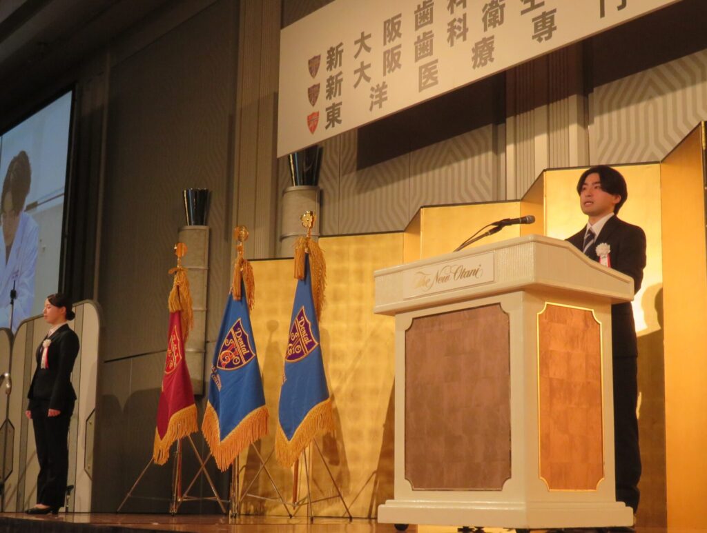 そして「学生生活は、毎日のレポートや実習など、決して楽なものではありません。想像以上に大きな壁があり、立ち止まりそうになったこともあります。そんな時、いつも救ってくれたのはクラスメートや先生方でした。『一緒に頑張ろう』という言葉に何度も救われました。歯科医療も一人では成り立ちません。感謝と笑顔を忘れず前に進んでほしいと思います。皆さんと共に成長できる日を楽しみにしています」と語りました。
